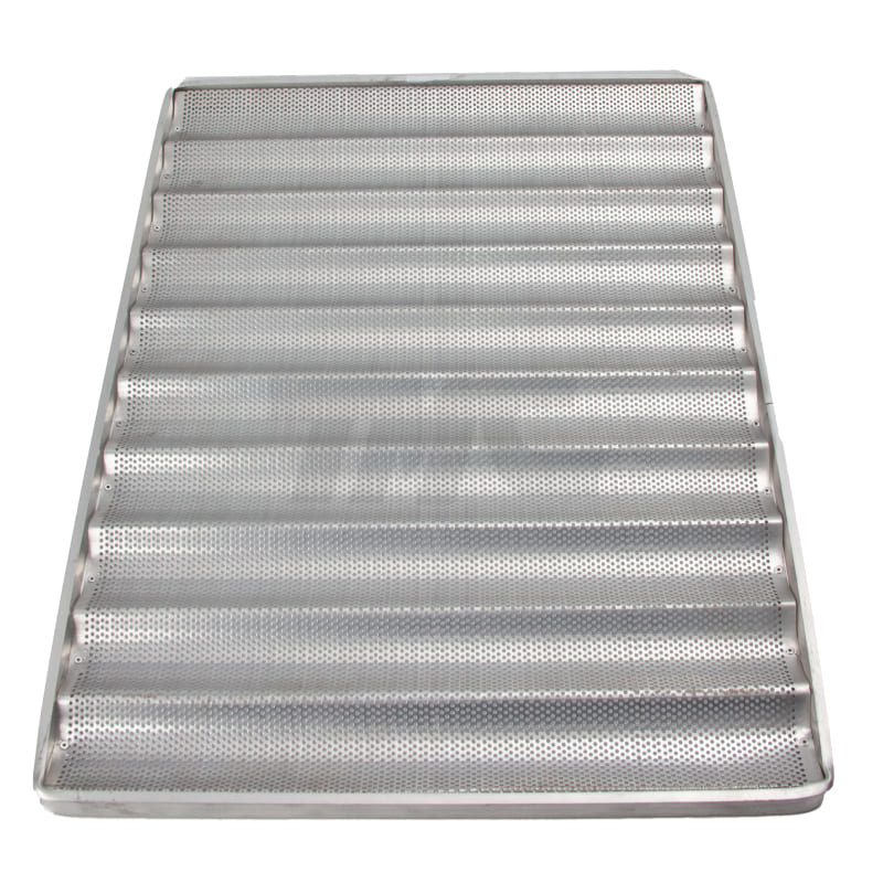Nuestra bandeja baguetera de aluminio microperforado garantiza una cocción perfecta para baguettes crocantes y esponjosas. Fabricada en aluminio 3003 de alta calidad, está diseñada con 11 ondas bien redondeadas de aproximadamente 8,0 cm de ancho, distribuidas transversalmente para asegurar una distribución uniforme del calor. Las baguettes pueden alcanzar hasta 68 cm de largo, ofreciendo resultados consistentes en cada horneada.